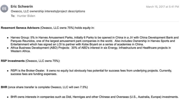“Hunter Biden’s longtime business partner, Eric Schwerin, sent him an email in March 2017 breaking down the ownership interests of Rosemont Seneca Advisors, which included a 5% stake in Harves Amusement Parks and ownership in Harves Sports and Entertainment,” the network continued.