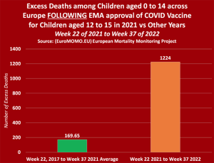 By August 30, 2022, European children had suffered through an appalling 755 percent increase in excess death. This excess in childhood mortality was not observed in 2020, during a time when governments and school systems sought to inundate children with fear, lockdowns, social isolation and forced masking. These actions were conducted under the pretense of “protecting the lives of children.” However, these totalitarian mind controls and behavioral abuses were used to coerce parents and their children to comply with an experiment – an experiment that has caused mass suffering and death.