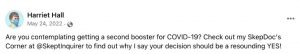 Dr. Harriet Hall, a.k.a. SkepDoc, was a strong proponent of every vaccine mandate for Covid, pushing everyone who read her blog to run out and get as many clot shots as they could get for free, and to shout out YES! in their own posts supporting her concocted theories.