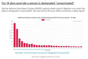 To add insult to injury, take a look at the VAERS (Vaccine Adverse Event Report System) graph for the first 14 days after the masses got vaccinated for Covid, and check out the mass-murdering first TWO DAYS after the injections were administered. These folks were listed by the corrupt Vaccine Industrial Complex as “unvaccinated” so that the massive death toll wouldn’t be documented properly for all to see.