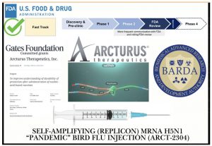 Phase Two: Design a self-amplifying (replicon) mRNA H5N1 “Pandemic” Bird Flu injection and name it with some acronym for a secretive illuminati code like ARCT-2304.